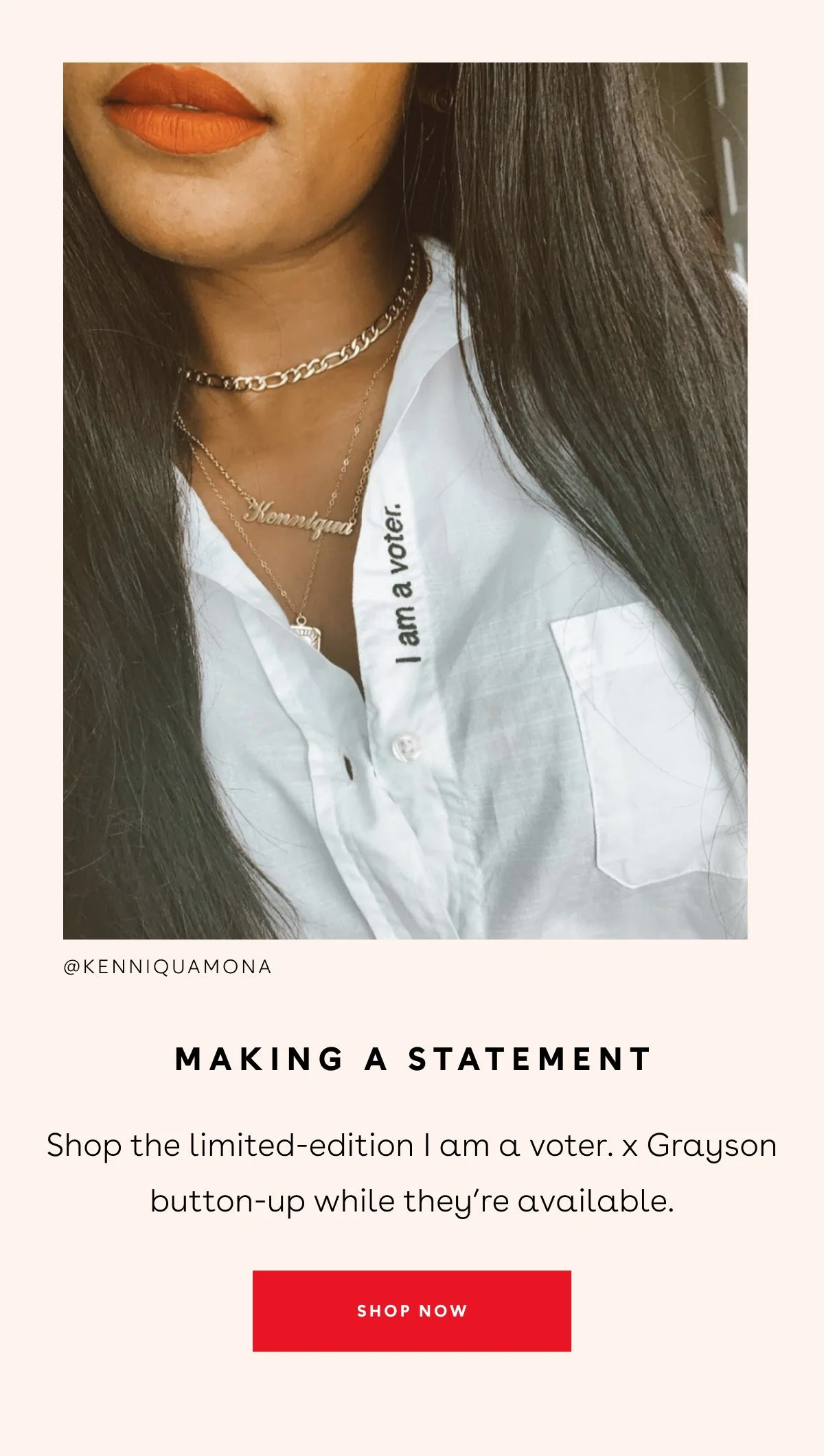An ongoing 3 years partnership with I am a voter., resulted in a 2x sold out custom button-up collaboration, a 10x increase in social engagement via a UGC campaign, email marketing content, and a donation to their cause.